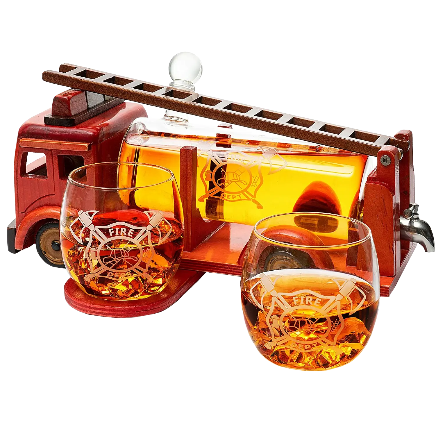 Firetruck Whiskey Decanter with Two 12 oz Glasses Gift Firefighter Gifts, Fireman, Firetruck Figurine, Police Gifts, Fire Department Gifts, Gifts for Firefighters! 600ml 13" L 6" H Gifts for Dad