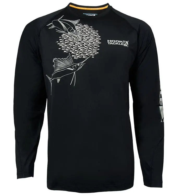 Hook & Tackle's® Feeding Frenzy features the Hook & Tackle logo on the front and on one sleeve of the shirt. It’s made with Wicked Dry & Cool Polyester that Goes With You, Wicks Moisture, Radial Sleeves for Expansive Arm Movement, UPF 50+ Sun Protection to Block Sun’s Harmful UV Rays and also Features a Rear Vent to Keep You in Breathable Comfort.