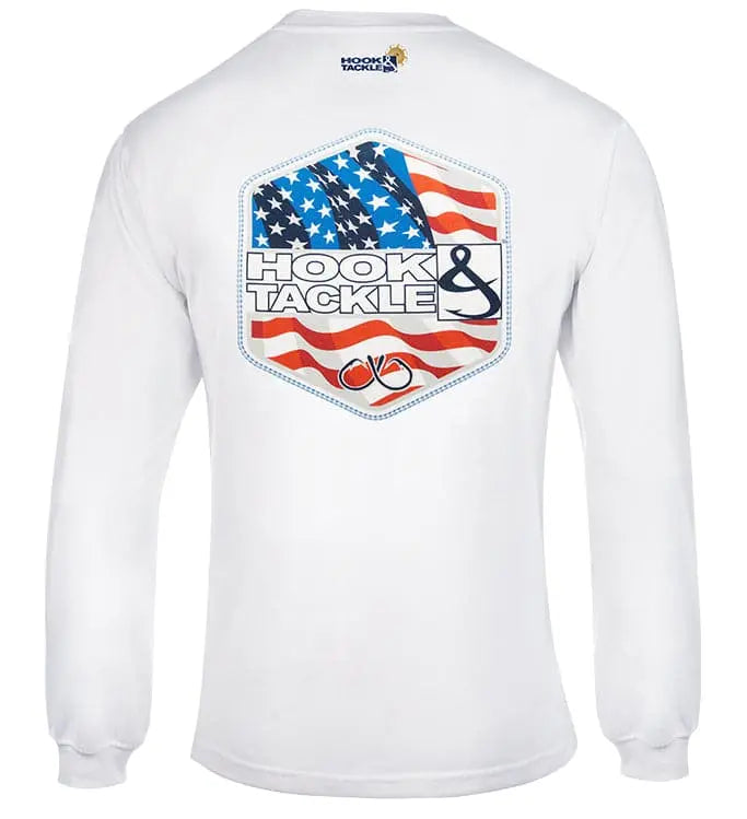 This Hook & Tackle® Star Spangled performance fishing long sleeve shirt features a shield containing the American flag on the rear and the Hook & Tackle® logo on one sleeve and on the front.